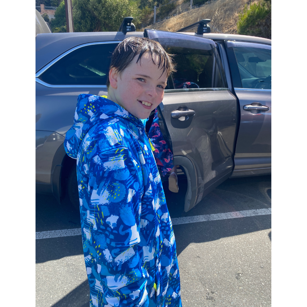 When choosing a swim parka for your child, we always recommend going as long as practical. This way it will last for years! Start with measuring your child from the back of the neck down to where you think you would like the parka to sit. Then look at the size chart, and choose by the length that suits. We find that younger children are happy to have the parka sit above their ankles, older children prefer mid calf.